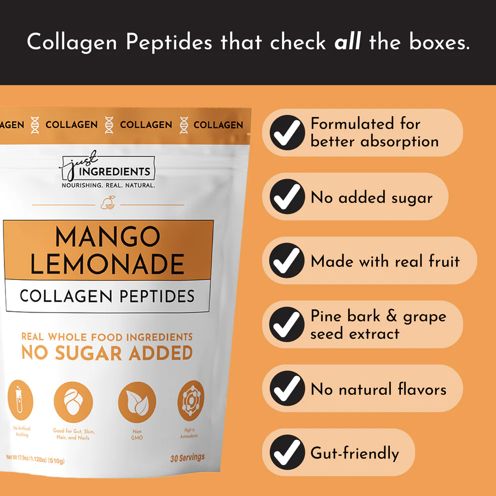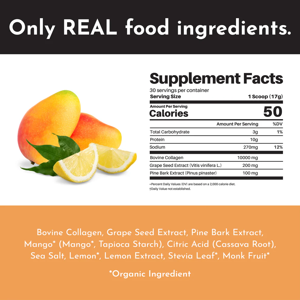 But we didn’t stop there. With added grape seed and pine bark extracts, you’re getting a dose of antioxidants that fight the bad stuff, keeping your collagen working overtime. And the flavor? It’s like a tropical vacation in a glass—sweet mango meets zesty lemonade.