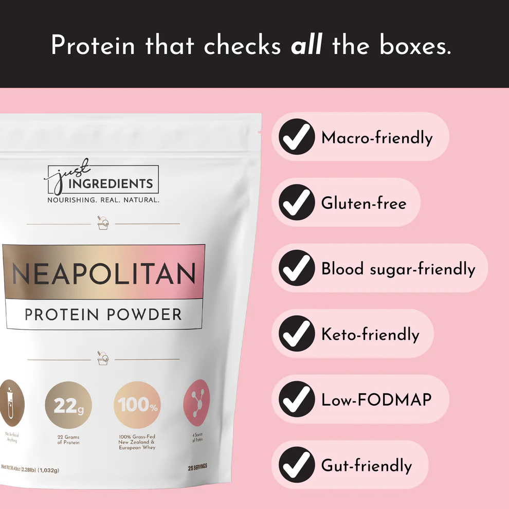 Just Ingredients’ Neapolitan Protein Powder combines the delicious flavors of chocolate, strawberry, and vanilla in a clean protein blend with 22g of protein per serving from grass-fed whey, collagen, and plant-based proteins. Sweetened naturally with monk fruit and stevia, it’s free of artificial additives, gluten, and sugar alcohols, making it gentle on digestion and keto-friendly. Ideal for post-workout recovery or a nutritious treat, it’s a wholesome choice for shakes, smoothies, or baking.